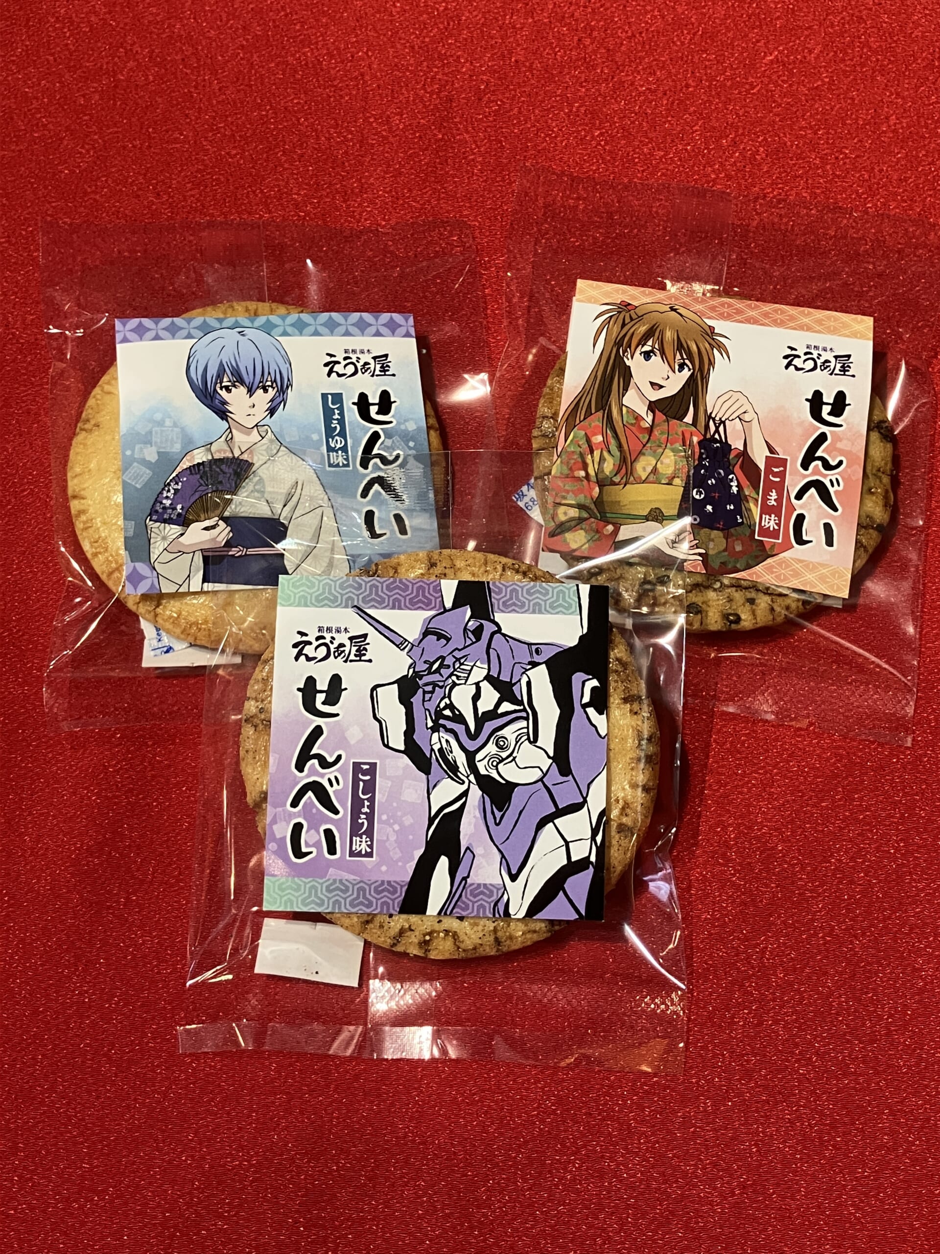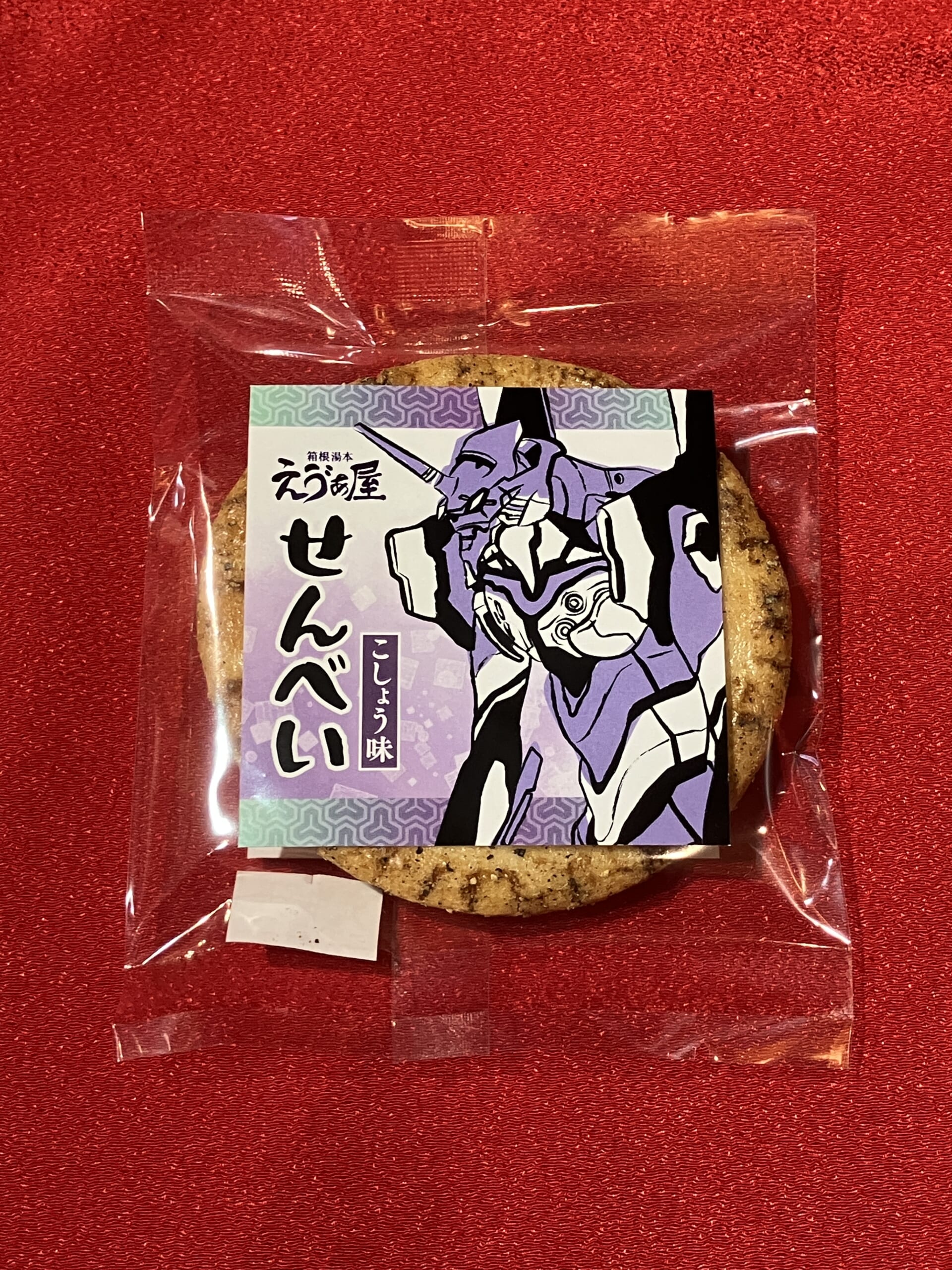 2026年02月28日【新商品:箱根湯本えゔぁ屋より、おせんべいが登場!】(2026.02.28更新)えゔぁ屋 箱根湯本えゔぁ屋より、おせんべいが登場!お土産にもぴったりな1品です! 【おせんべい(3種)】<レイ(しょうゆ)> <アスカ(ごま)> <初号機(こしょう)>価格:各 275円(税込) ※画像はイメージです。実際の商品と異なって見える場合がございます。※商品の数には限りがございます。お品切れの際はご容赦ください。※仕様・内容は予告なく変更になる場合がございます。※取扱商品・在庫状況は各店舗へお問い合わせください。